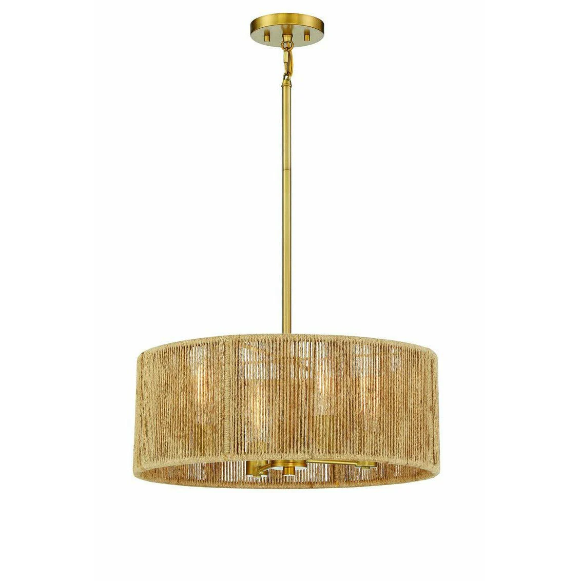 This Ashe 4-light pendant has a warm, organic design. Its drum shade is strung with rows of textured rope, allowing light to shine through and providing a stylish look even when the lights are off. Finished in warm brass. Ashe is 20" in width and has an adjustable height ranging from 8" to 62". It uses four standard size bulbs with a max of 60 watts per bulb. Comes with four 12" downrods and one 6" downrod, plus 80" of cord.