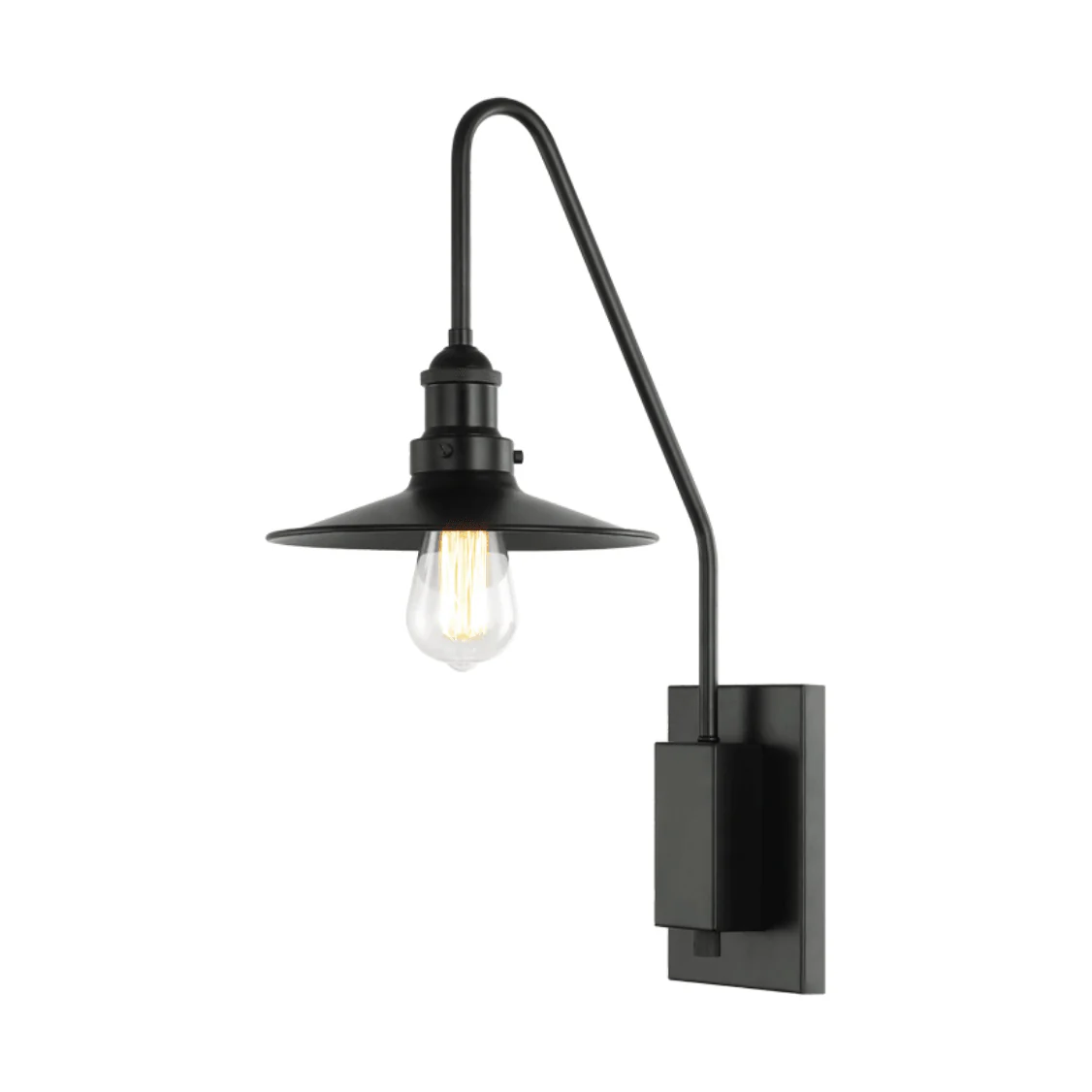 Bingrahm is a vintage style wall sconce with a modern edge. These dimmable sconces are available in solid finishes of Aged Gold Brass or Black, paired with a rectangular canopy to create a bold statement piece.