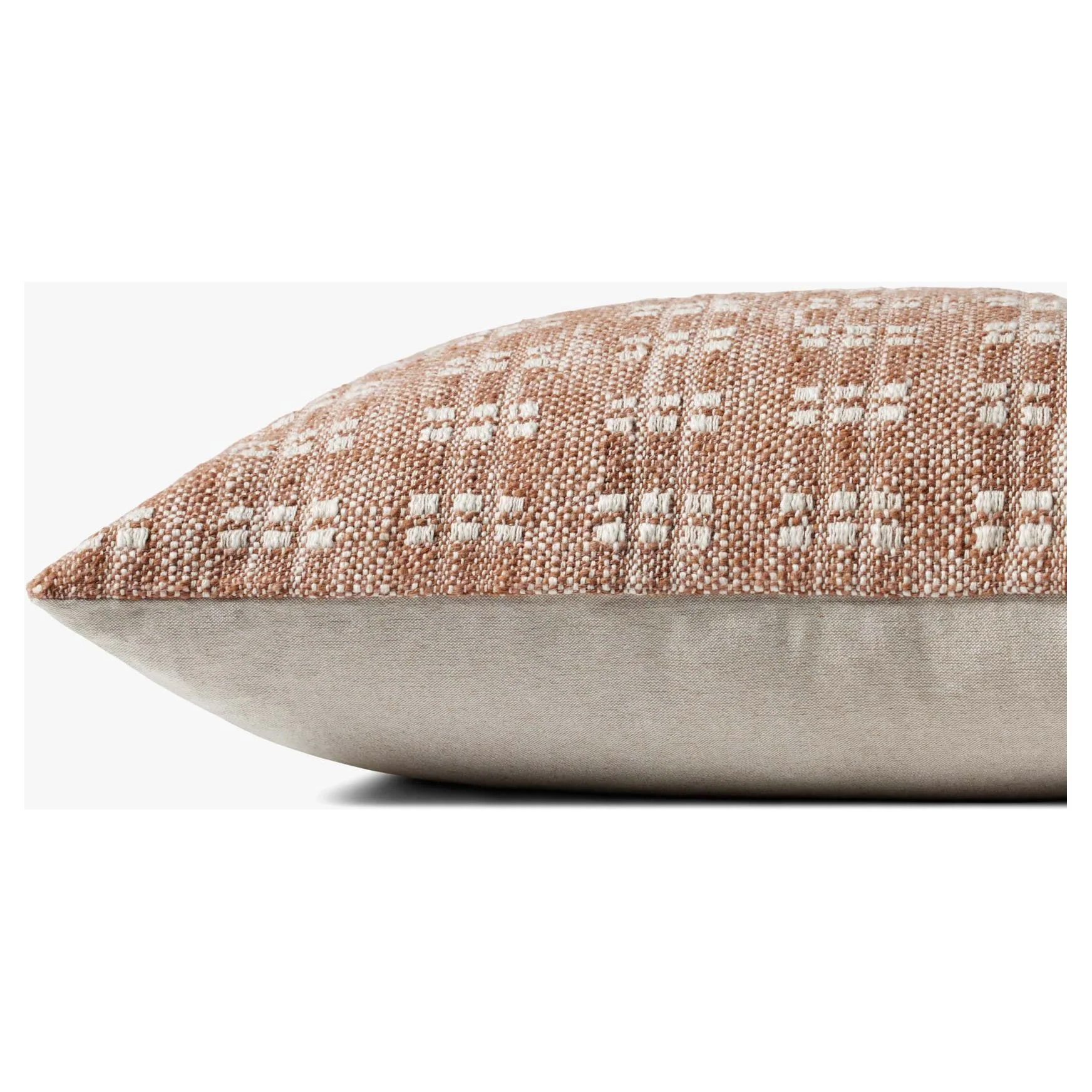 This rust-hued throw pillow from Magnolia Home by Joanna Gaines x Loloi features a two-toned design with a light and airy aesthetic. The pillow cover is made of cotton, polyester, and rayon and measures 22” x 22”, a standard size to style in living rooms and bedrooms.
