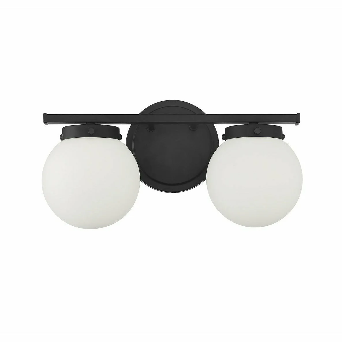 Add a bubbly look to your bath with this Edie 2-light bath bar! Its streamlined design features globes of opal glass, a shape that is echoed in the circular backplate. This light will really pop in bathrooms with contemporary, modern and midcentury modern styles. Finished in matte black, it is also damp area rated. This bath light is 8 inches in height and 16 inches in width with a backplate that is 6 inches in diameter and 0.75 inch in depth. It extends 7.25 inches from the wall and can be mounted with the shades facing up or down. It uses 2 candelabra size bulbs of up to 60 watts each, is dimmable and is LED compatible.