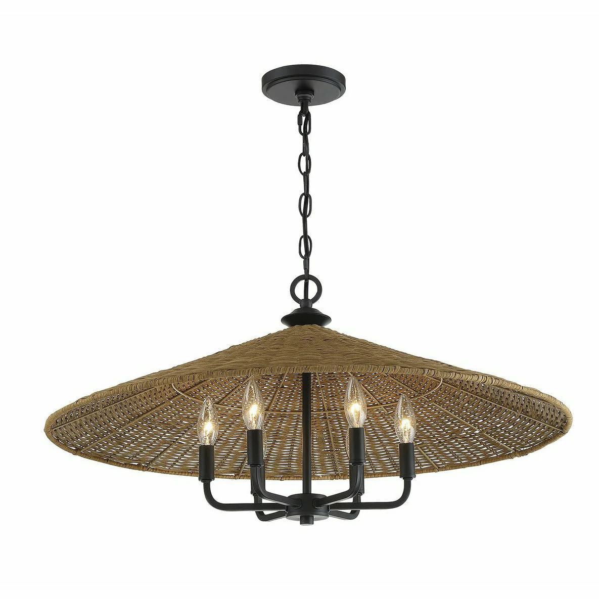 Able to equally suit Coastal, casual, and transitional décor, the Eman Collection features a natural rattan coolie shade in a Dark Rattan finish anchored by a handsome Matte Black finish. Measuring 30" wide x 14 5/8" high, this six-light pendant provides ample illumination from six 60-watt candelabra bulbs.