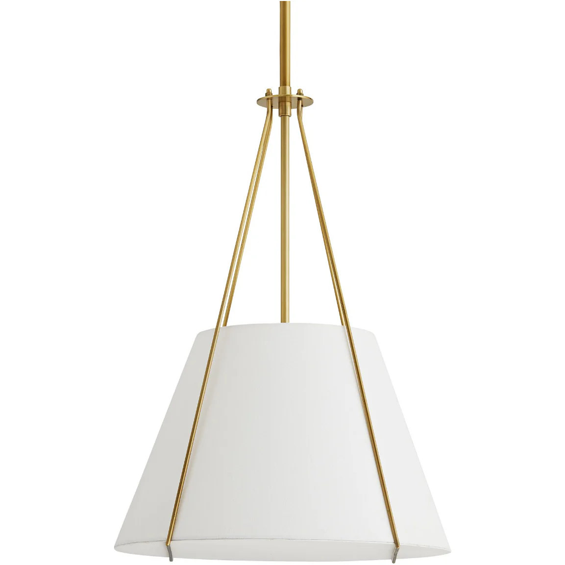 Finding a balance between modern and traditional elements, the heloise creates architectural interest. A classic conical white linen shade is suspended within an antique brass steel frame to contemporize the look. When in use, the iron detail on the bottom of the shade plays on its architectonic appeal by creating an interesting lightscape. We see this hung in multiples over a kitchen island or breakfast nook table. Additional pipe available. Damp rated, though limited outdoor conditions may affect finish.