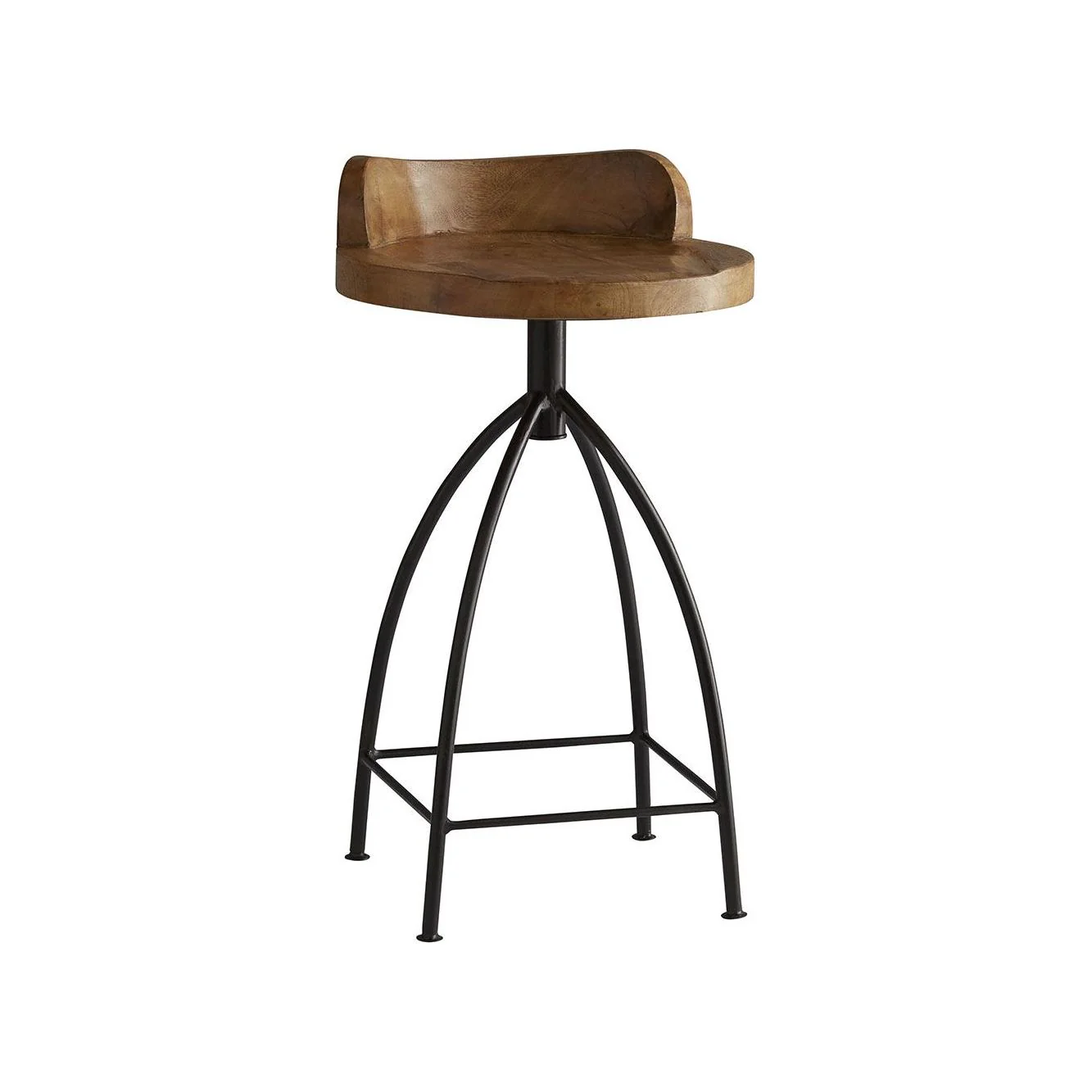 Rustic counter stool features sandblast antique waxed wooden swivel seat and natural iron base. Seat height is fixed. Due to the artisan nature of this piece the seat height and support bar may vary up to 1" from the dimension listed.