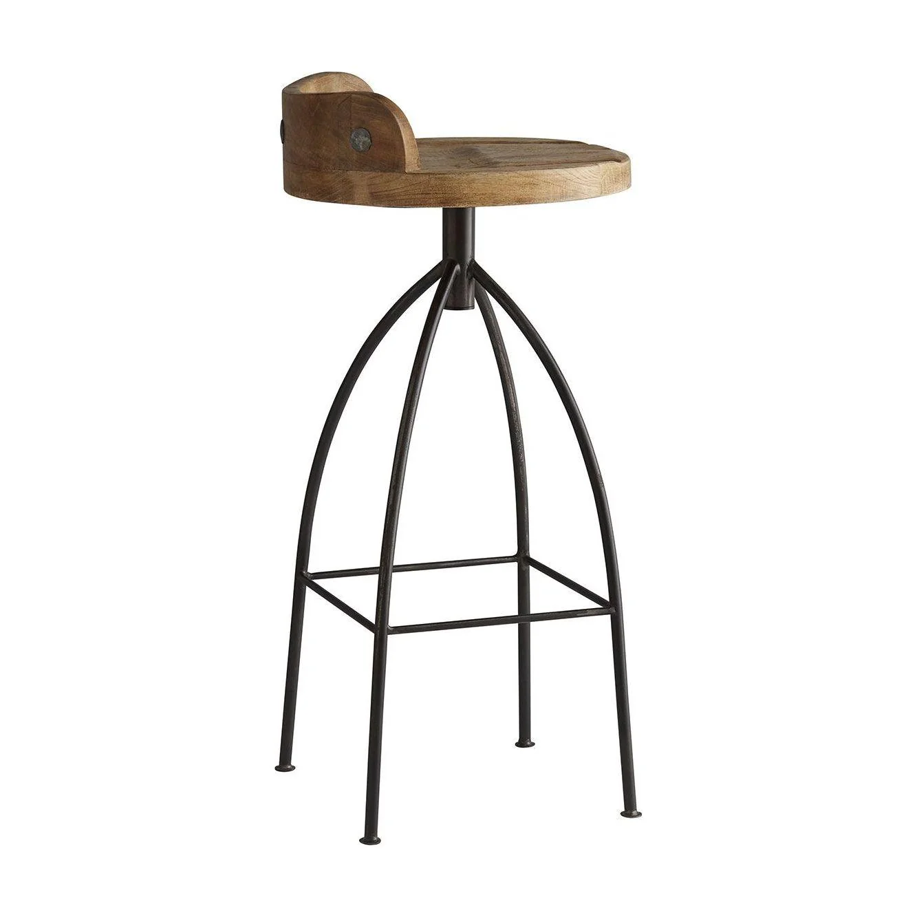 Rustic marries industrial with this tall natural iron barstool with swivel wood seat in natural wax finish for counters/bars. Seat height is fixed. Support bar placement may vary up to 1".