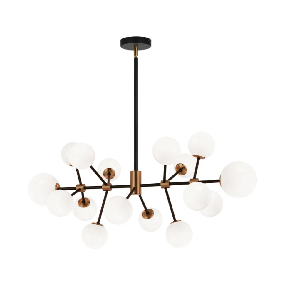A retro inspired collection that will integrate seamlessly with many decors. Novu comes in Opal glass on sleek black rods offset with Aged Gold Brass accents. Available in a complete family including various sized ceiling fixtures, a wall sconce and a flush mount.