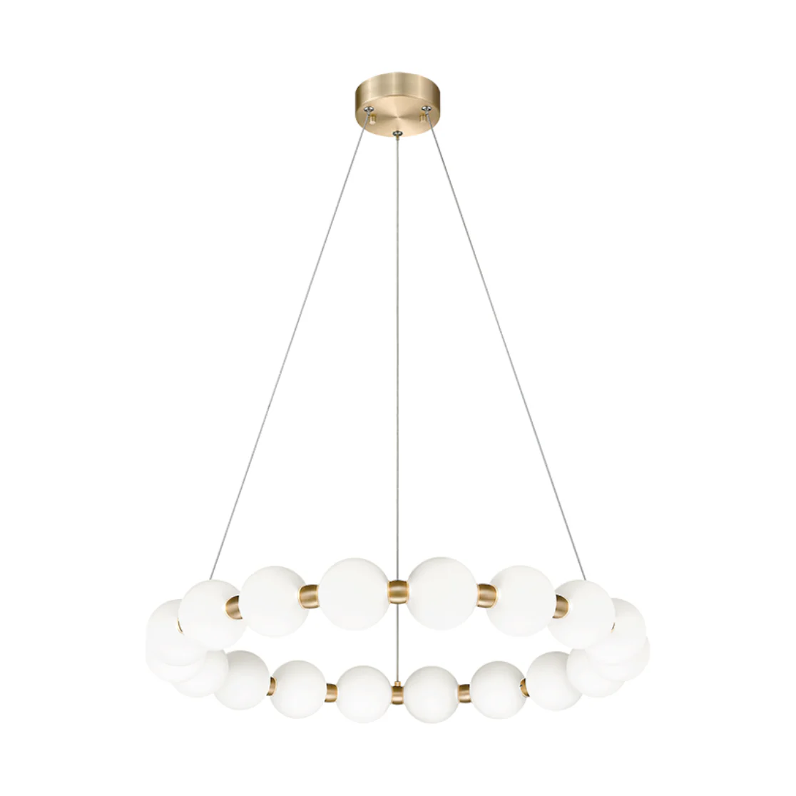 Oni is an elegant tasteful design inspired by the beauty of pearls.This stunning LED series features round Opal Glass threaded together on an Oxidized Gold body. Silver cables attached to the Oxidized Gold canopy complete the refined look. Offered in 3 sizes.