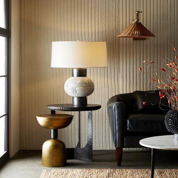 Our versatile, articulating wall light dons a woven wicker shade for a fun, textural mix. Finished in antique brass, it's useful as a reading lamp, picture light or, as windsor uses in her own home, as accent lighting over bookcases. Shown with a 3 3" frosted globe bulb.