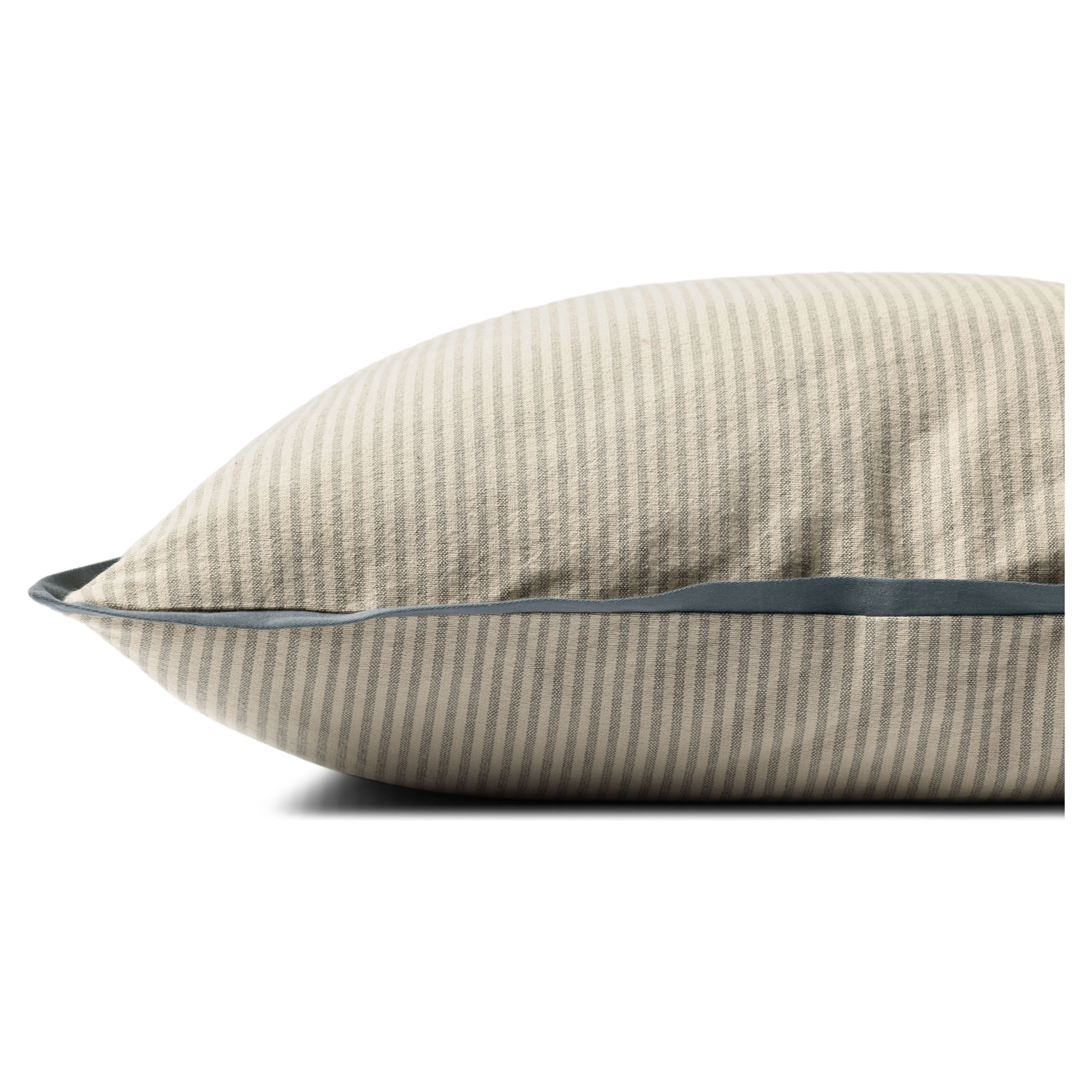 Sullivan is a beige-striped throw pillow with soft blue flange edges designed by Jeremiah Brent x Loloi. The 22” x 22” decorative pillow is made in India of 100% cotton, a sophisticated accent for modern home decor.