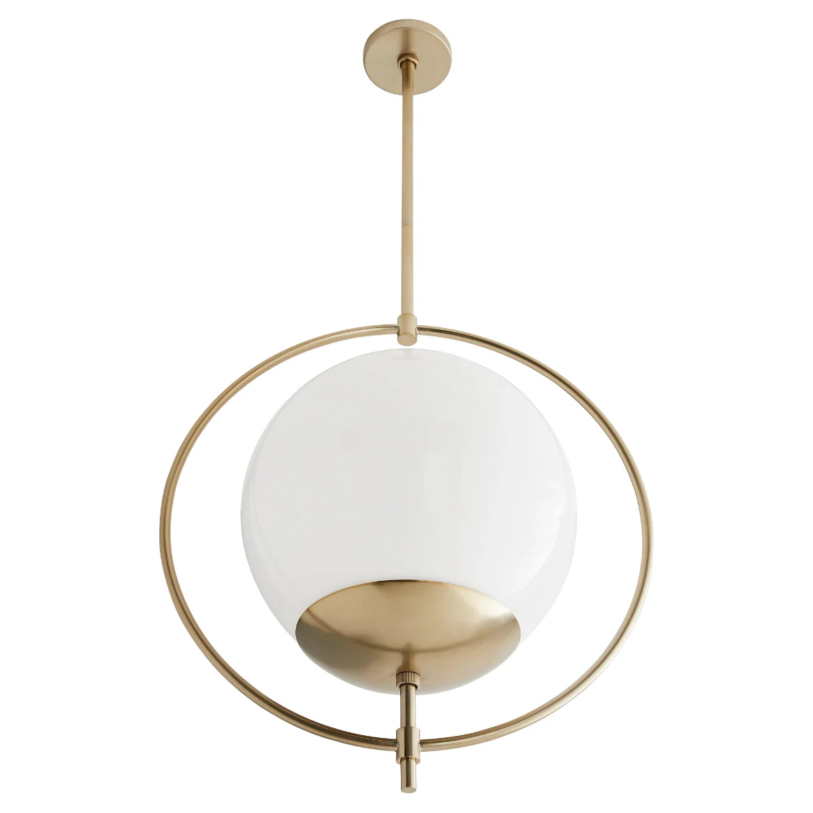 The depths of spatial design are defined with the volta pendant. An opal glass globe is suspended by a steel pipe finished in pale brass that encompasses it in free-form fashion. The simple geometric silhouette of the circumambient fac��ade creates a visual of a floating orb, delivering a dimensional dynamic to a space. Damp-rated, although limited covered outdoor conditions may affect finish. Additional pipe available.